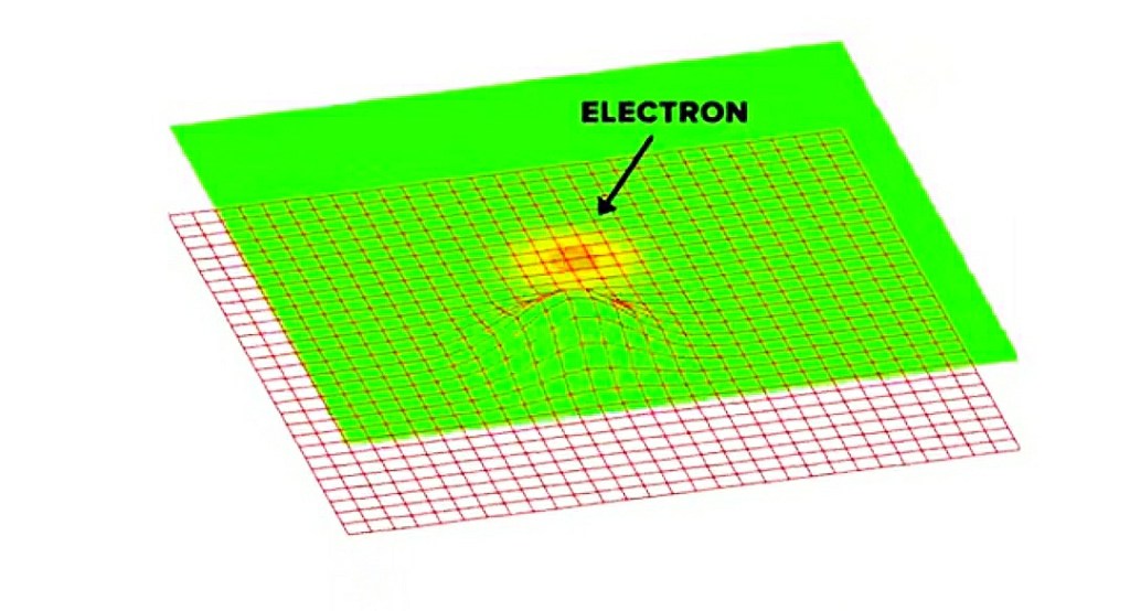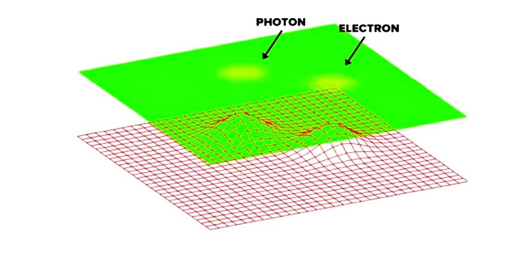 Another thing he spearheaded was to figure out a way to make a fully quantum theory. He did this by finding a quantum formulation of the electric field surrounding the proton. We call this the “second quantization revolution.” This just means that the electric field was expressed quantum mechanically and that it joined such things as a quantum description of the location of matter, which was covered by the first quantum revolution. In the ensuing years, these ideas have been generalized to cover all of the subatomic forces, specifically the strong nuclear force, the weak nuclear force and electromagnetism. While each force has a different precise formulation, they are all examples of what we now call a quantum field theory or QFT. Although each theory has its own interesting peculiarities, I want to talk a little about some general truths of all quantum fields. In modern physics theory, one can picture all subatomic particles as beginning with a field. Then the particles we see are just localized vibrations in the field. So, according to quantum field theory, the right way to think of the subatomic world is that everywhere- and I mean everywhere- there are a myriad of fields. Up quark fields, down quark fields, electron fields, etc. And the particles are just localized vibrations of the fields that are moving around. The idea can also explain how particles interact. For example, suppose you have an electron moving along. The electron is a localized vibration of the electron field. If the electron emits a photon, then the quantum field theory way of looking at things says that some of the energy of the electron field sets up a localized vibration of a photon field which then moves away (as illustrated below).